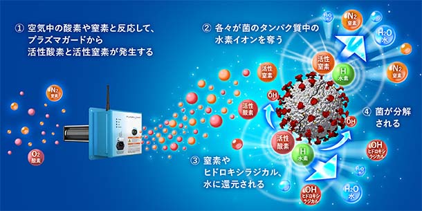 低温プラズマにより、空気中の酸素や窒素、水分から活性酸素や活性窒素を発生させ、それらがウイルスや菌を分解します。