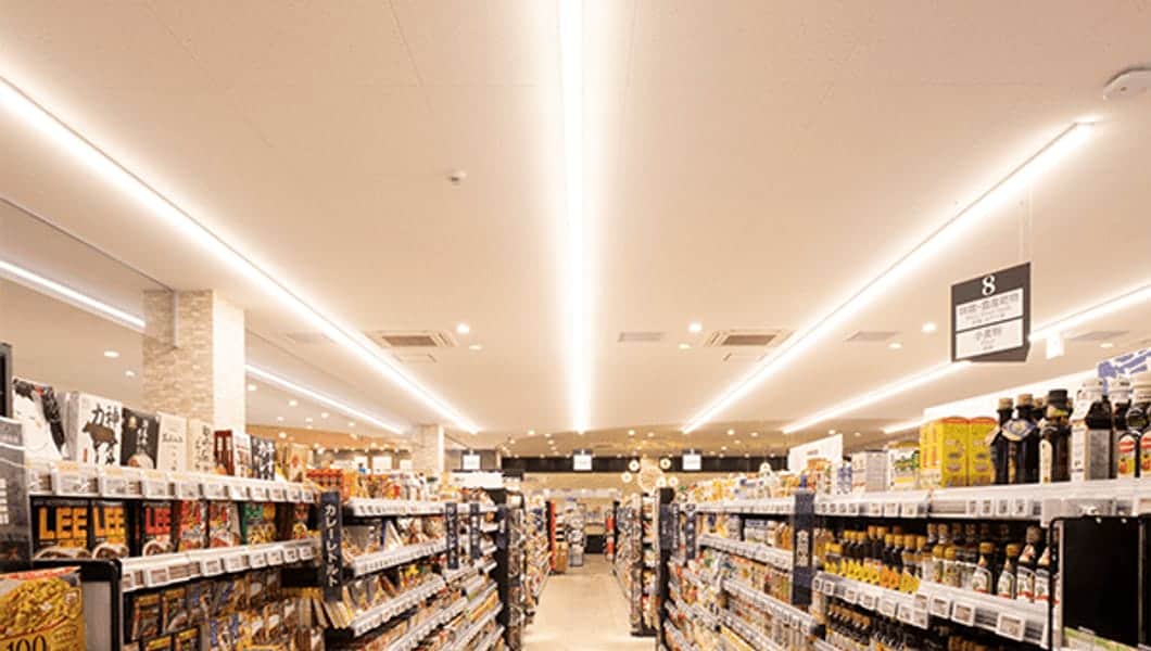 一体型ベースライト / 直管LEDランプ / 非常灯・誘導灯 / ダウンライト / スポットライト / 高天井用照明 / 投光器・看板照明 / 道路照明 / 住宅照明 / 無線制御システムLiCONEX / LIDIOシリーズ / 基本デザイン設計 / 内装工事 / 床材 -