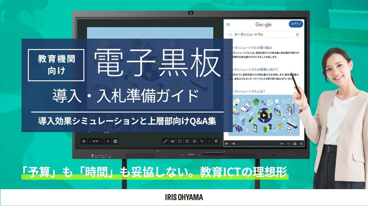 ICT教育に活用できるおすすめのアイテムとして、Googleモバイルサービスを標準搭載※したアイリスオーヤマの「電子黒板」を紹介します。