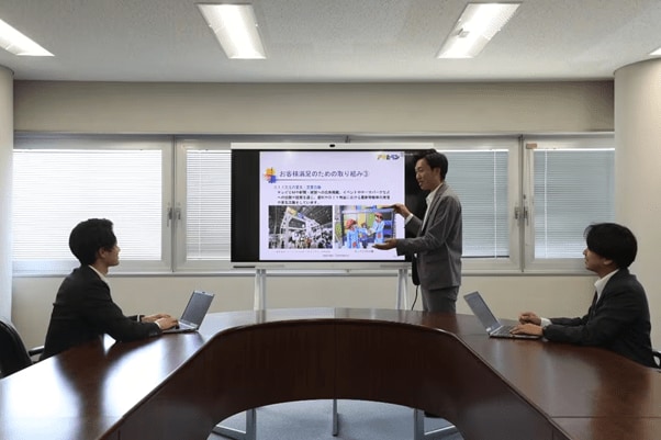 株式会社アサヒペン(大阪府)では、会議室にアイリスオーヤマのAIインタラクティブホワイトボード PRO 65型を導入しています。取り組み内容の発表や資料共有をデジタルホワイトボード上で行うことで、参加者全員の理解が深まり、議論もより活発に。オフィスに1台あるだけで、会議やプレゼンテーションの効率が大きく向上しています。