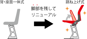既設の脚部をそのまま残し、イスだけを変更することで省施工、省廃材、席数の維持が可能です。また、自立起立シートなので通路スペースを広く確保でき、スムーズな立ち上がりと通行を可能にします。