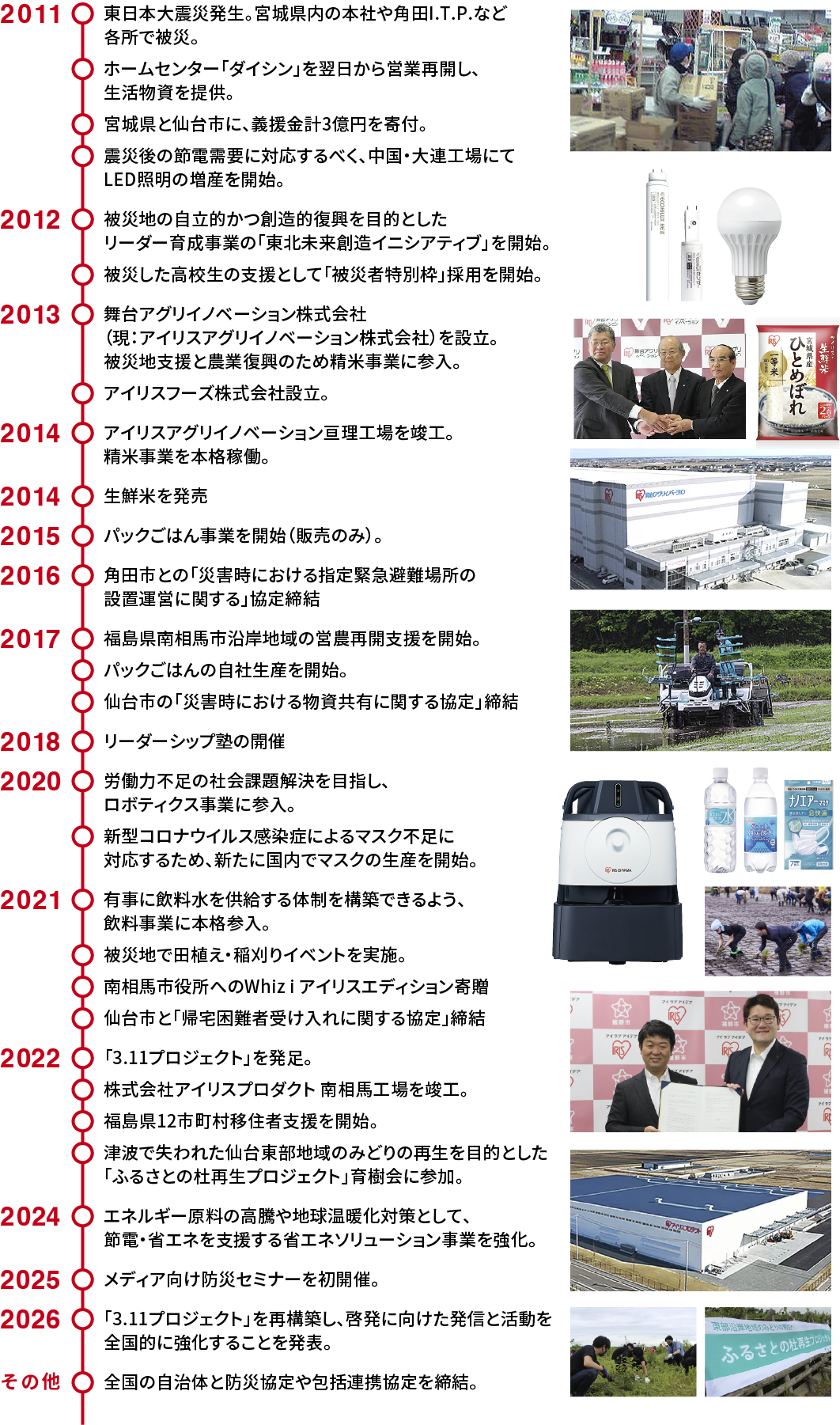 東日本大震災から15年、アイリスグループは様々な支援活動を推進してきました。 しかし、復興はまだ終わっていません。東北にはまだまだ支援が必要な地域が存在しています。 アイリスグループは引き続き、私たちの持っている技術や知見、ネットワークを活用して多方面から本気で復興に取り組みます。