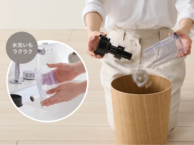 ゴミ捨てはかんたん2step [ダストカップを外す→ゴミを捨てる]
