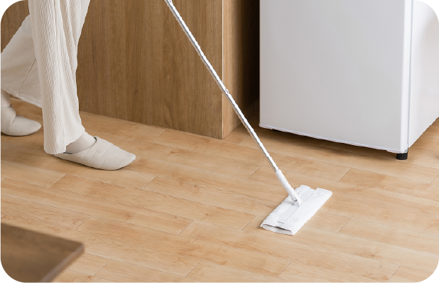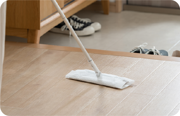※ 当社基準試験による。油汚れを想定した10×10cmのクレヨン汚れをフローリングの床材に塗る。 DN-FW201Pを各ワイパーに装着し、錘1kgを載せたフロアワイパーを5往復させて試験前/ 試験後の床材の重さを測定。 (SWD-B-W【強モード】:平均0.090g、SSE-FW:平均0.042g)を比較 ※実際の環境により汚れが落ちる往復回数は異なります。※固まった油汚れや床材に染み込んでシミになったような汚れは落とせません。
