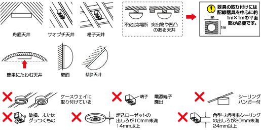 傾斜している天井や、サオブチ天井、格子天井などの不安定な場所や凹凸のある天井には取り付けしないようにしてください。