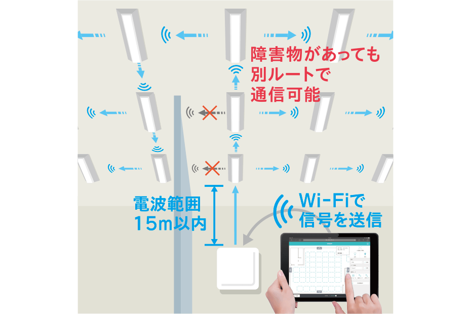 西嶋様 無線方式では一般的に建物内にある貨物や柱で電波が遮られるため通信状況が悪くなるのが難点でした。アイリスオーヤマのライコネックスは、通信プロトコル「メッシュリンク」によって障害物があっても照明制御の通信が可能なことから、導入しました。また、タブレットやスマートフォンで集中制御や照明器具の個別制御が可能な点、グループ設定などの設定変更が容易にできる点が良いと思いました。また、中継用調光コントローラーが不要のため、施工工期が短く工事費も節約できる点もメリットに感じました。