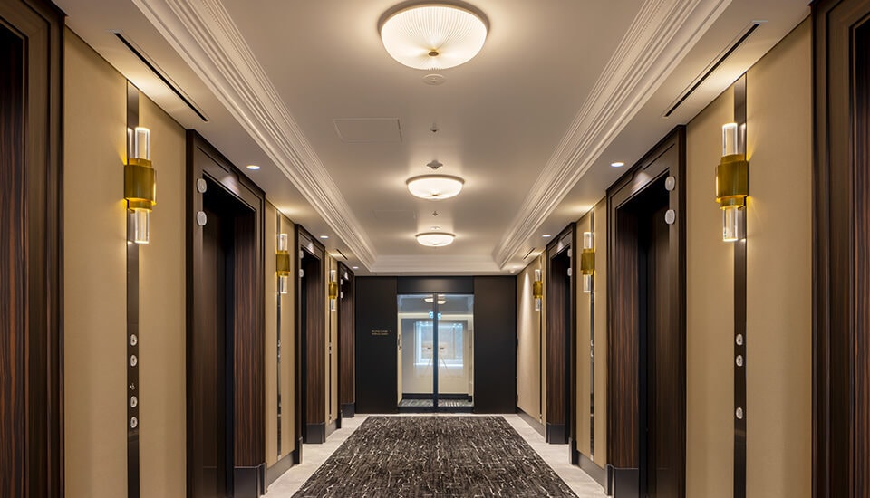 旧九段会館が建てられた当時、設計者が空間とともに照明もデザインされていたようで、とても一体感があるという印象を受けました。ですので、私たちも照明をデザインすることで全体的な空間コーディネートをすることは意識しました。照明も建材と同じ考え方で、やはり素材感も大切。いかにこの空間にマッチして、違和感がない照明を選ぶかが大切で、アイリスオーヤマさんの照明器具もエレベーターホールなどに使わせていただきました。既製品もあったのですが、空間コーディネートという意味では新たに製作していただいた方が良いものもあり、担当者の方には何度も現場に足を運んでいただき、しかも、製品を取り入れるメリットに加えて、想定し得るリスクもしっかりとご説明いただいたのは、理解そして善後策の検討につながり、助かりましたね。