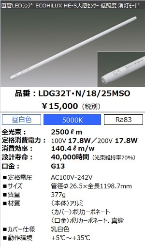 LDG32T・N/18/25MSO/C 直管LEDランプ ECOHiLUX HE-S人感センサー 低照度 消灯モード