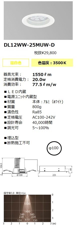 DL4WW-25MUB-D LEDダウンライト埋込穴径Φ75 1/2配光角25°3500K 調光対応