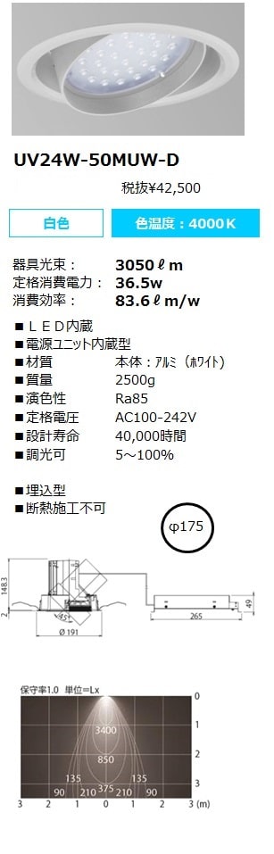 UV18WW-50MUW-D LEDユニバーサルダウンライト埋込穴径Φ150 1/2配光角50°3500K 調光対応