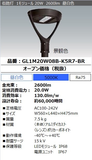 GL1M20W08B-K5R7-BR 街路灯 1モジュール 20W 2600lm 昼白色