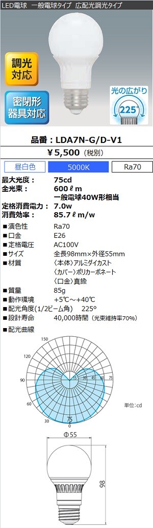 LED電球 一般電球タイプ 広配光/調光器対応 昼白色相当
