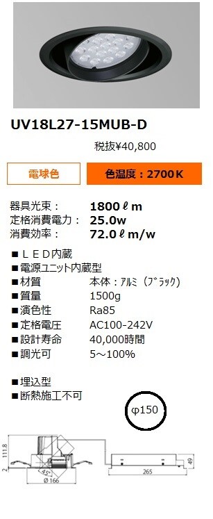 [生産終了] LEDユニバーサルダウンライト埋込穴径Φ150 1/2配光角15°2700K 調光対応