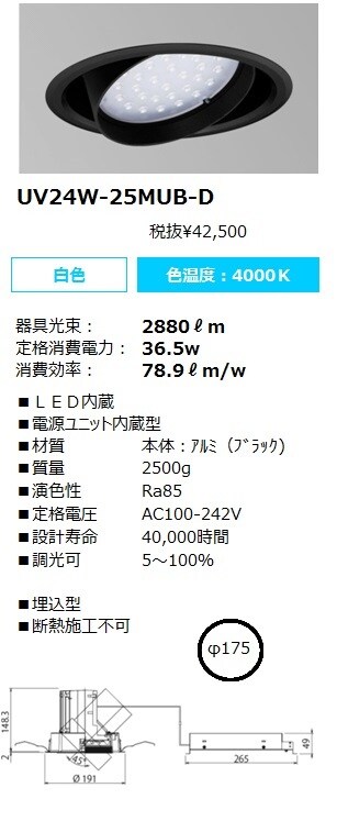 [生産終了] LEDユニバーサルダウンライト埋込穴径Φ175 1/2配光角25°4000K 調光対応