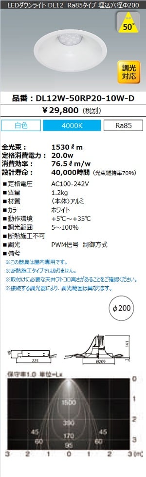 LEDダウンライトリニューアルタイプΦ200-Ф100 12灯 1/2配光角50°4000K 調光対応