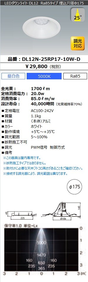 LEDダウンライトリニューアルタイプΦ175-Ф100 12灯 1/2配光角25°5000K 調光対応