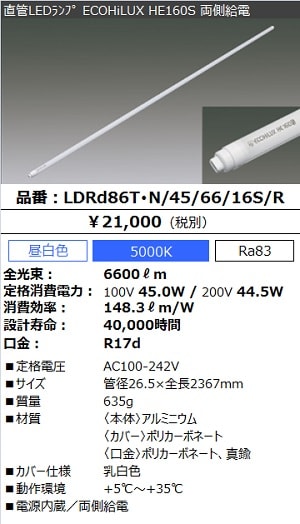 [生産終了] 直管LEDランプ ECOHiLUX HE160S (両側給電)