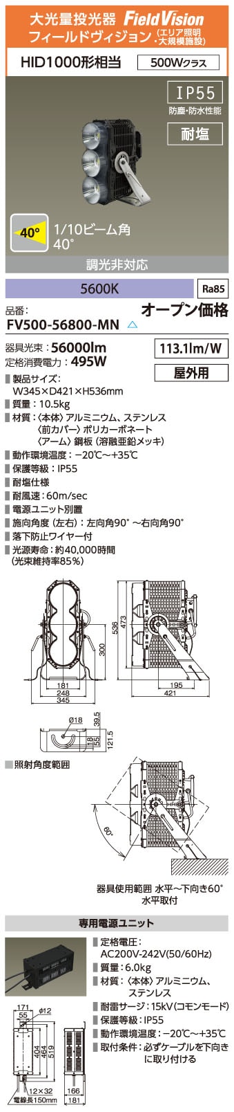 スタジアム照明 Field Vision 60,000lm 5600K Ra80 1/2ビーム角40°
