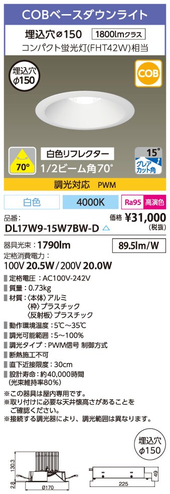 ベースダウンライト高演色 PWM調光 φ150広角 反射板白 4000K