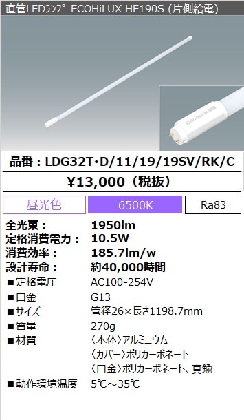 直管LEDランプ ECOHiLUX HE190S (片側給電)