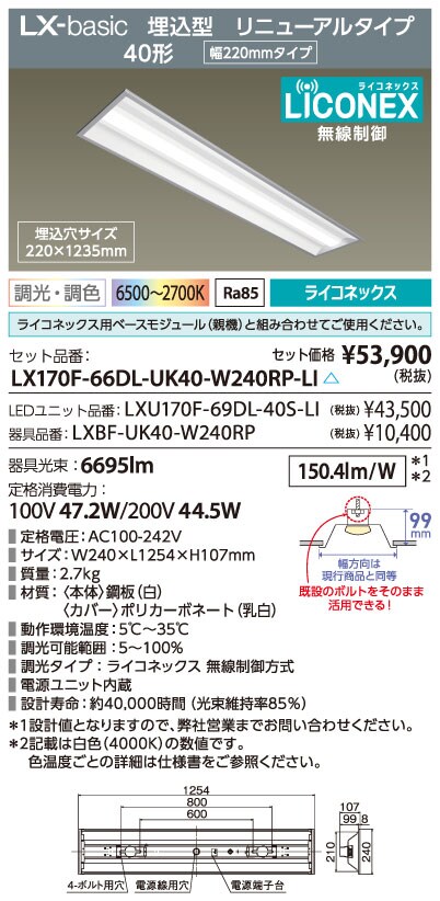 ラインルクス 埋込型 リニューアルタイプ LiCONEX調光 調色 40形 幅220