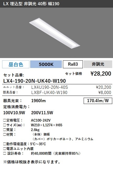 LX4-190-20N-UK40-W190 ラインルクス 埋込型 非調光 40形 幅190