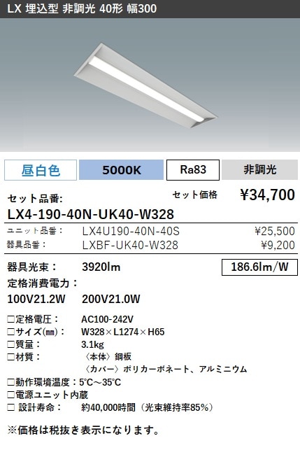 LX4-190-40N-UK40-W328 ラインルクス 埋込型 非調光 40形 幅300