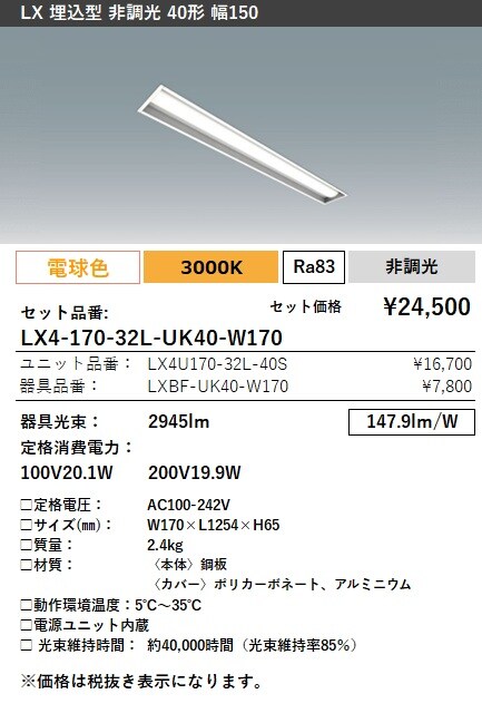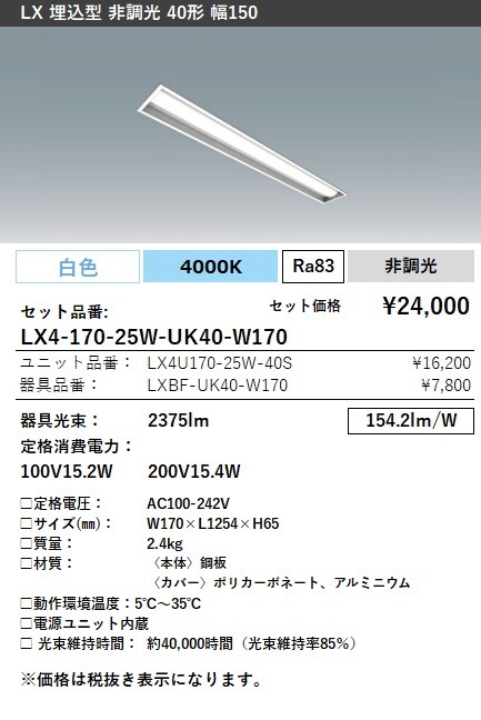 LX4-170-25W-UK40-W170 ラインルクス 埋込型 非調光 40形 幅150