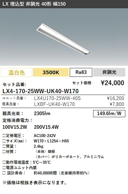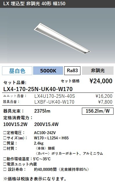 LX4-170-25N-UK40-W170 ラインルクス 埋込型 非調光 40形 幅150