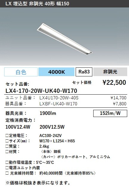 LX4-170-20W-UK40-W170 ラインルクス 埋込型 非調光 40形 幅150