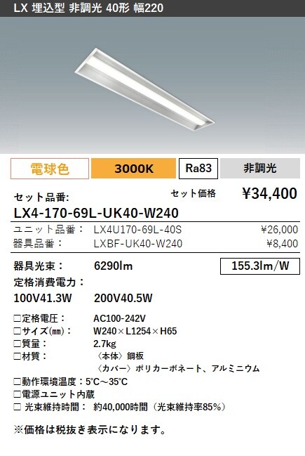 LX4-170-40W-UK40-W240 ラインルクス 埋込型 非調光 40形 幅220