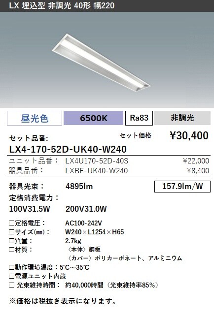 LX4-170-52W-UK40-W240 ラインルクス 埋込型 非調光 40形 幅220