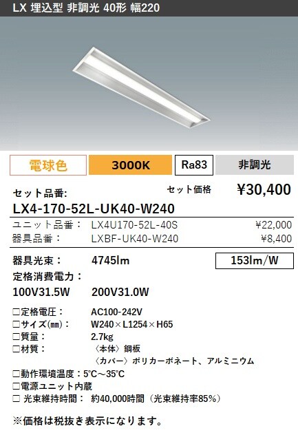 LX4-170-52N-UK40-W240 ラインルクス 埋込型 非調光 40形 幅220