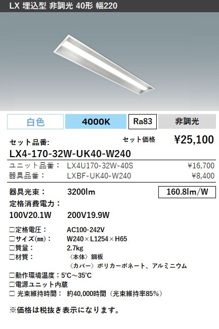 LX4-170-32W-UK40-W240 ラインルクス 埋込型 非調光 40形 幅220