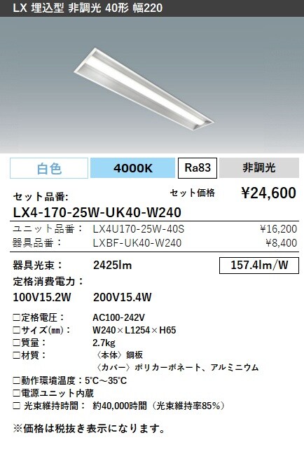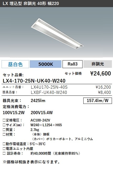 LX4-170-25N-UK40-W240 ラインルクス 埋込型 非調光 40形 幅220