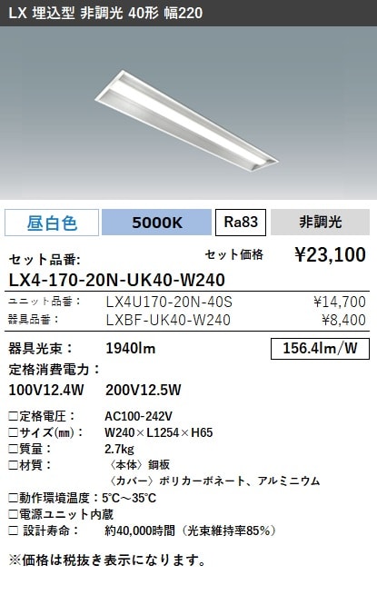 LX4-170-20W-UK40-W240 ラインルクス 埋込型 非調光 40形 幅220
