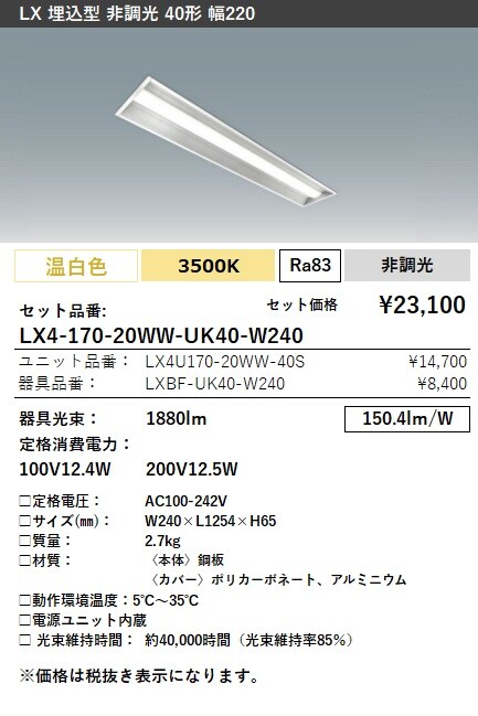 LX4-170-20WW-UK40-W240 ラインルクス 埋込型 非調光 40形 幅220