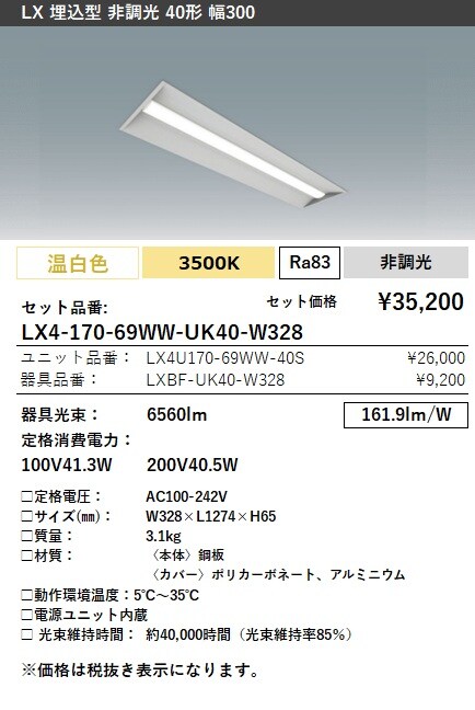 LX4-170-69W-UK40-W328 ラインルクス 埋込型 非調光 40形 幅300