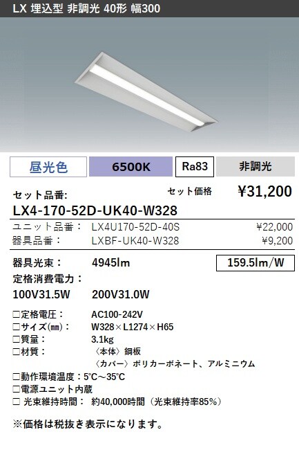 LX4-170-52W-UK40-W328 ラインルクス 埋込型 非調光 40形 幅300