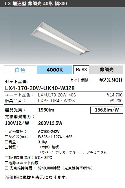 LX4-170-20W-UK40-W328 ラインルクス 埋込型 非調光 40形 幅300