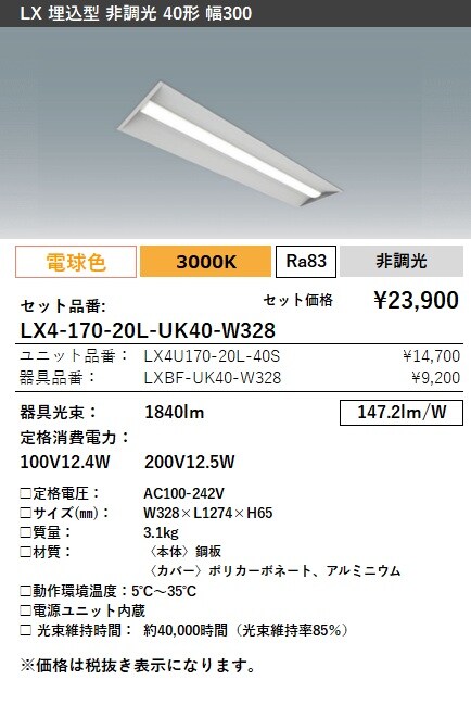 LX4-170-20WW-UK40-W328 ラインルクス 埋込型 非調光 40形 幅300