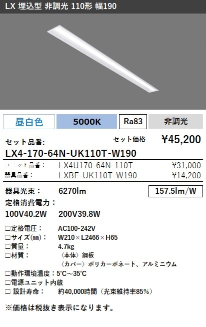 LX4-170-64WW-UK110T-W190 ラインルクス 埋込型 非調光 110形 幅190