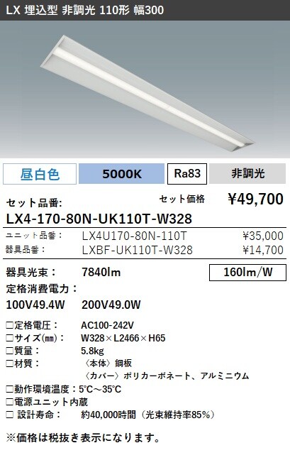 LX4-170-80N-UK110T-W328 ラインルクス 埋込型 非調光 110形 幅300