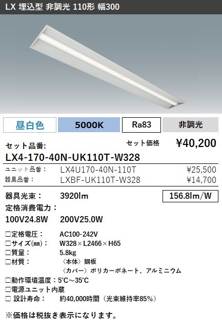 LX4-170-40W-UK110T-W328 ラインルクス 埋込型 非調光 110形 幅300