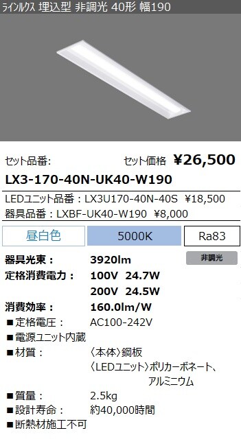 LX3-170-40N-UK40-W190 ラインルクス 埋込型 非調光 40形 幅190
