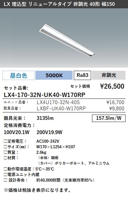LX4-170-32N-UK40-W170RP ラインルクス 埋込型 リニューアルタイプ 非調光 40形 幅150