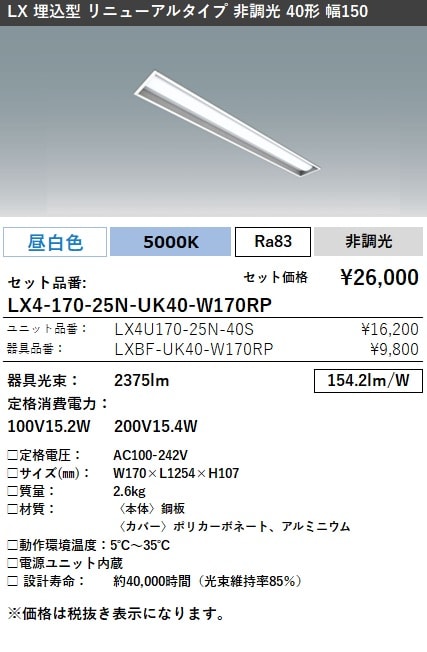 LX4-170-25W-UK40-W170RP ラインルクス 埋込型 リニューアルタイプ 非調光 40形 幅150