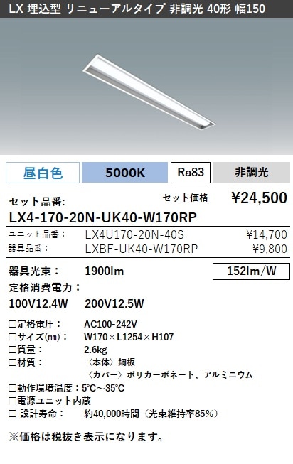LX4-170-20N-UK40-W170RP ラインルクス 埋込型 リニューアルタイプ 非調光 40形 幅150