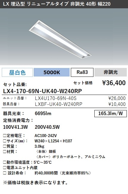 LX4-170-69N-UK40-W240RP ラインルクス 埋込型 リニューアルタイプ 非調光 40形 幅220