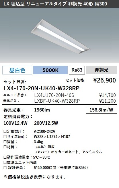 LX4-170-20N-UK40-W328RP ラインルクス 埋込型 リニューアルタイプ 非調光 40形 幅300